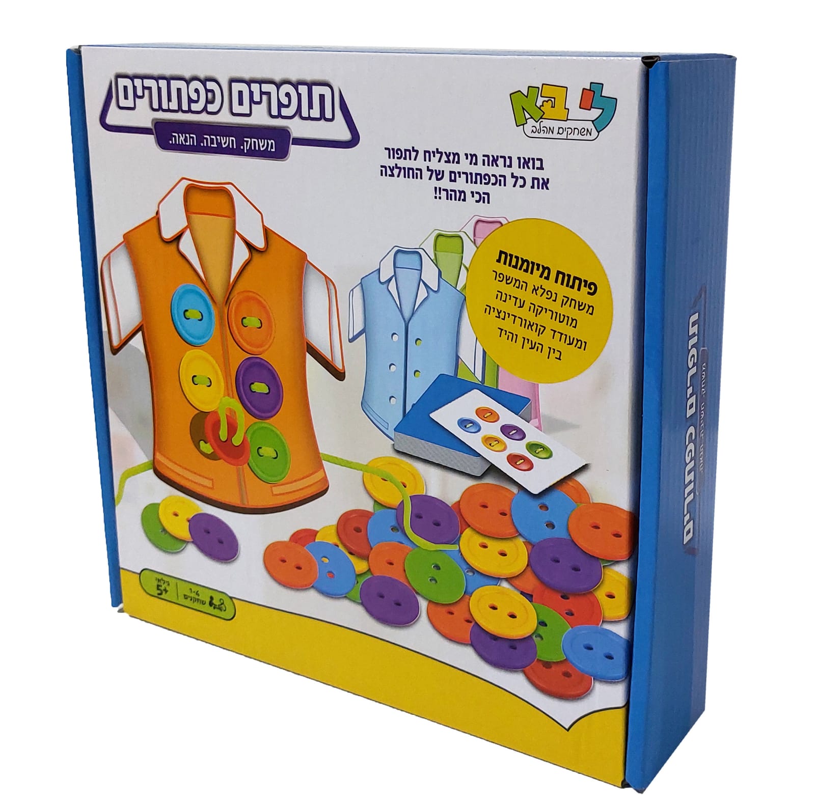 המשחק כולל חולצות וכפתורים צבעוניים להשחלה, ונותן מענה לפיתוח קשר עין-יד, ריכוז, ודמיון יצירתי.